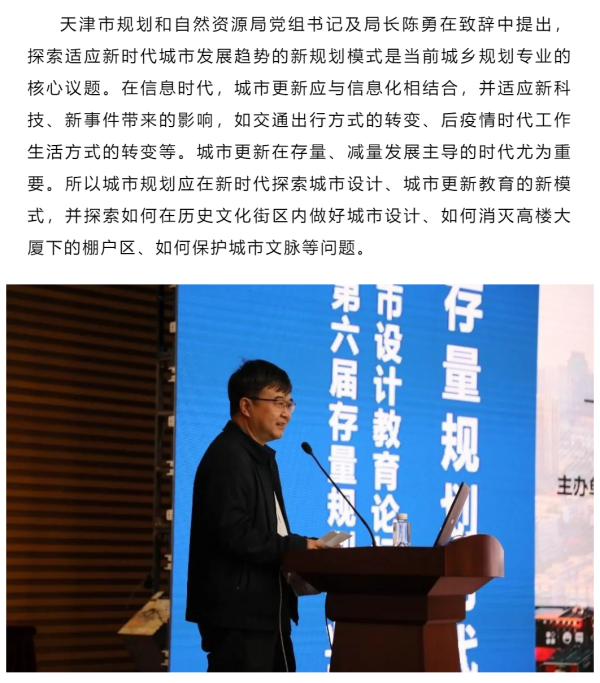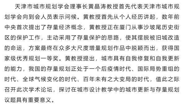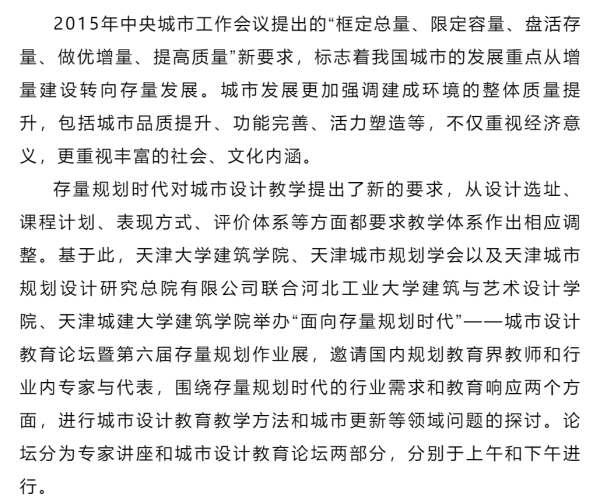 正值十四五规划开局之年,为纪念沈玉麟先生诞辰百年,深度研讨城市设计教育的转型之路,2021年4月24日,“面向存量规划时代”——城市设计教育论坛暨第六届存量规划作业展,在天津成功举办。本次论坛由天津大学建筑学院、天津市城市规划学会、天津城市规划设计研究总院有限公司主办,河北工业大学建筑与艺术设计学院、天津城建大学建筑学院联合主办。