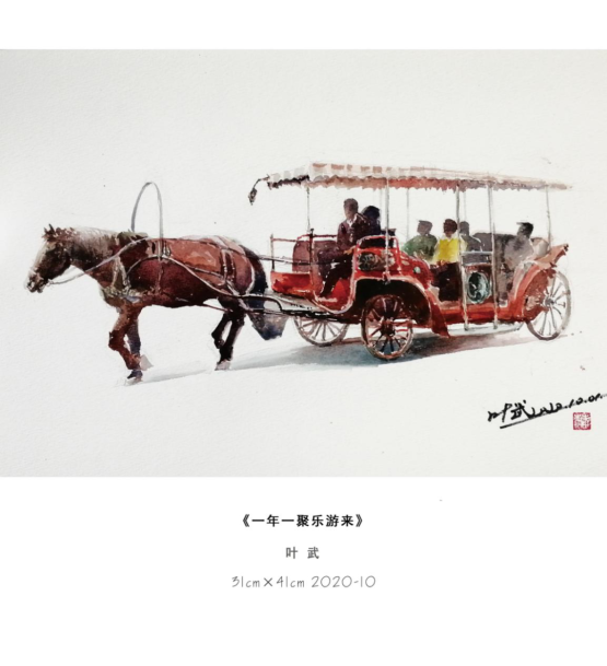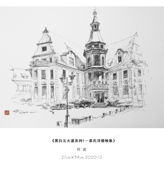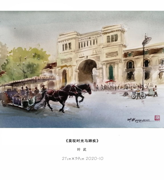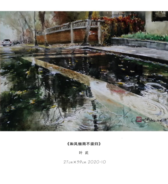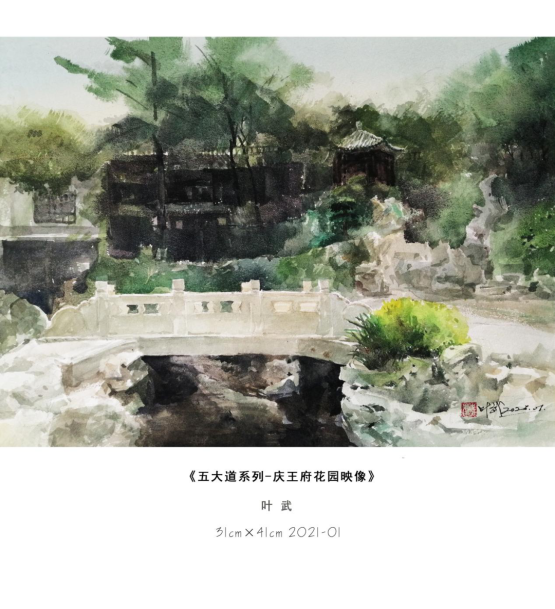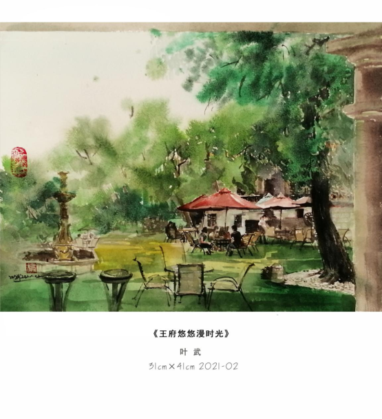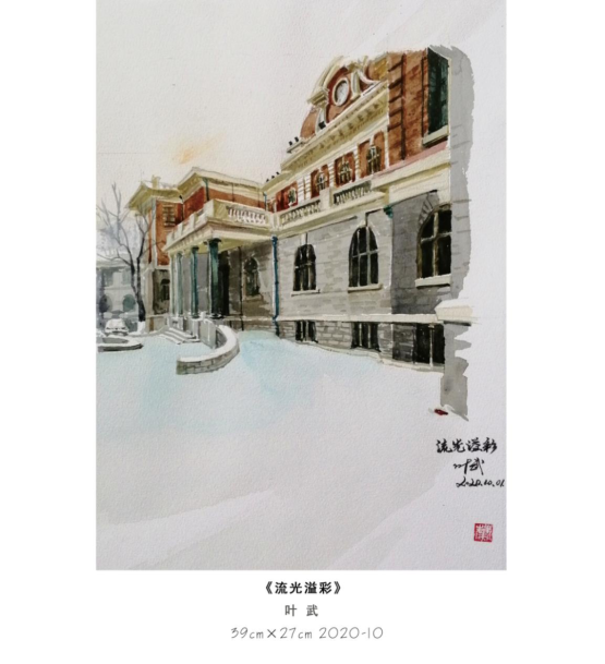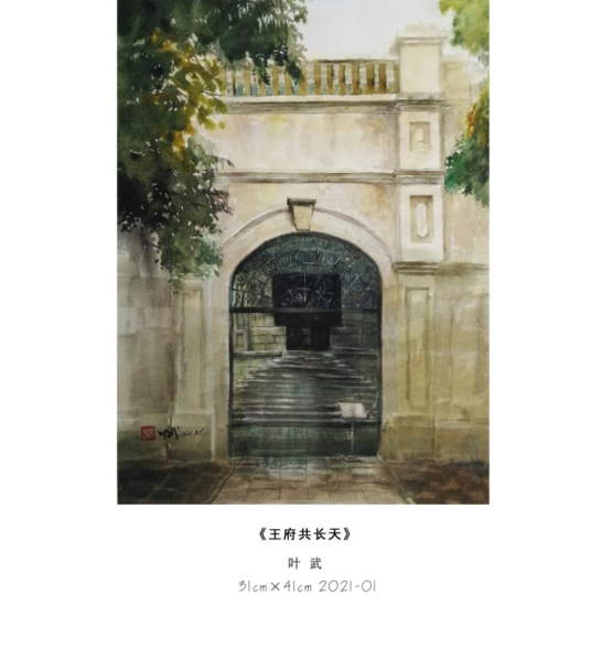 此次展览展出了叶武创作的五大道系列风景水彩作品,其中不乏庆王府院内的清雅景致。水彩画面透映出一种绅士的大气与雅致之美。将瞬间和永恒的感觉结为一体,通过对光线的控制,对构图不断探索挑战,和对灵敏的笔触转换,造就出那透明、轻快、水色淋漓的画面,清新文艺却又不落俗套。