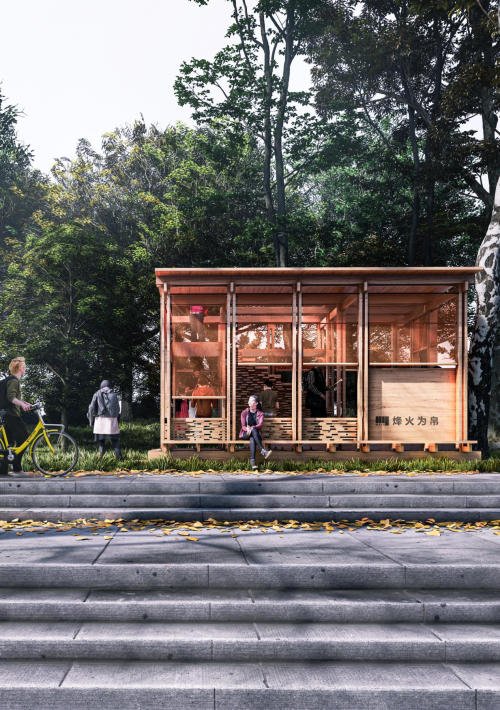 穿越千年,结合本次竞赛“致敬齐长城”的主题,我们在双梁夹双柱的结构框架内,以木板堆叠的形式,对古齐长城烽火台砖石垒砌的建构方式进行了转译,使得形式上由实变虚依然能够实现联系。更进一步,我们将旌旗的意向与帘幕结合在一起,当风吹过,猎猎有声,仿佛回到古战场一般;当它平静,徐徐垂下,又无时无刻不在浸润木材的温馨,化作静谧无声的林间驿站。此时此刻,齐文化中行商的传统,古老烽火台的历史厚重,透过我们的建构,时空产生微妙的连结,留待诸君体验。