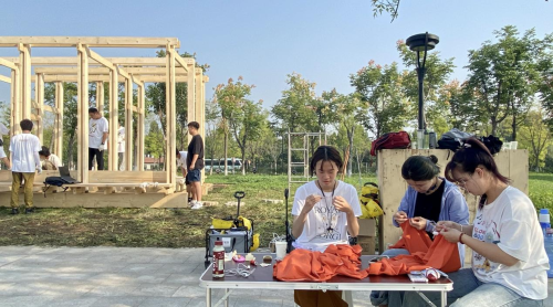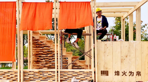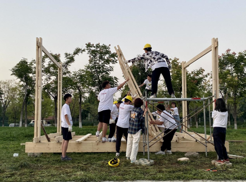地基、横梁、立柱,在一个个结构中体会从设计到建造的神奇过程;钻孔、打钉、拧螺栓,在一步步工艺中体会建筑技术的精妙之处。日出十分,方正的木梁稳稳伫立,散发着木构件的柔和光芒;黄昏将近,轻柔的晚风吹起劳作之人的衣帛,帘幕飘飘,好似烽火。