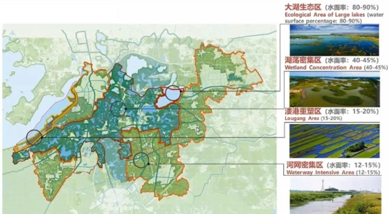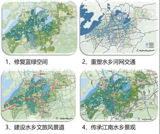 修复蓝绿空间:一方面要提高水面率,规划五年内将水面率由现在的30%提高到33%。另一方面,针对历史形成的不同生态基底,形成四类蓝绿生态空间:大湖生态区、湖荡密集区、溇港重塑区、河网密集区。将蓝绿生态空间进一步分解为小的生态单元,并采取不同的措施。如在湖荡密集区内需识别并移除对生态环境有害的建成区域,在河网密集区内则应整合优化水网系统等。在此基础上,针对不同的生态单元,构建不同景观的生态林地。