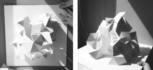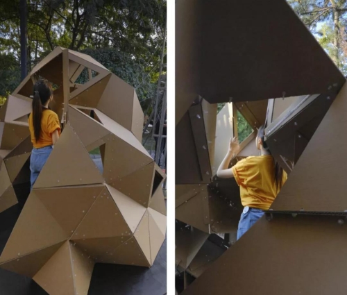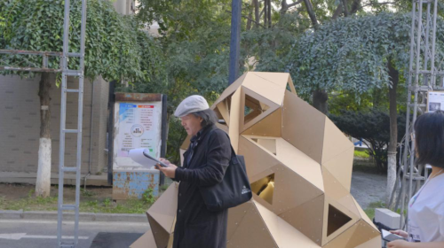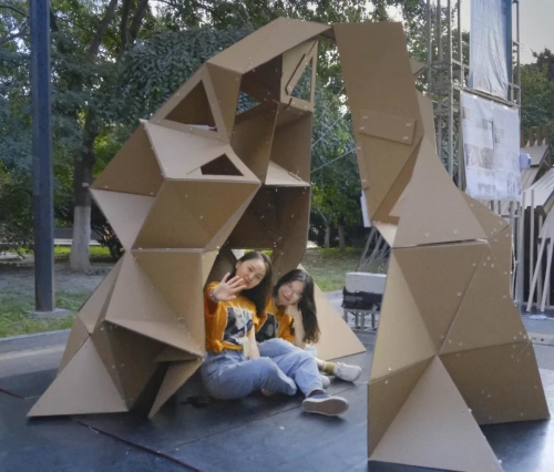 下午16时,看着生长完成的“太湖石”矗立在阳光下,大家紧绷了一天的心情终于放下了。午后阳光透过树枝,照耀在瓦楞纸板的表面上,“太湖石”瘦、漏、皱、透的空间特征展现其独有的意蕴,给建构作品带来别致的东方韵味。