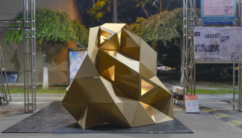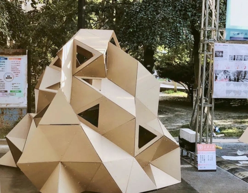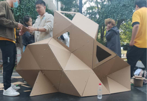 8小时的搭建,从最初的忐忑不安,到搭建中期的紧张无言,到最后阶段于时间赛跑的冲刺。下午15时30分,内部含有一个休憩小室和一条曲径的“太湖石”生长成型。此时,离最终评比仅剩半个小时,同学安装上感应灯带,给作品添上最后一笔。