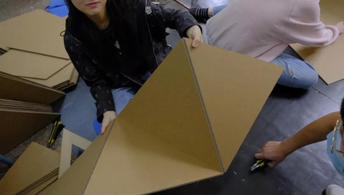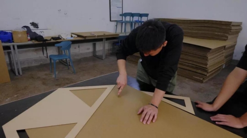 在准备阶段,我们碰到了一个难题。本次作品是进行模块化设计,单体简单但是模块较大,同时构筑的原材料瓦楞纸板只由鲁美届时提供,天大队无法提前加工瓦楞纸模块。在尝试过多种方法后,同学们只能回到借助模具、手工加工板材的“土方法”。