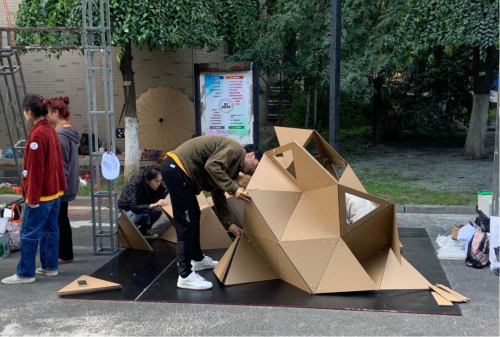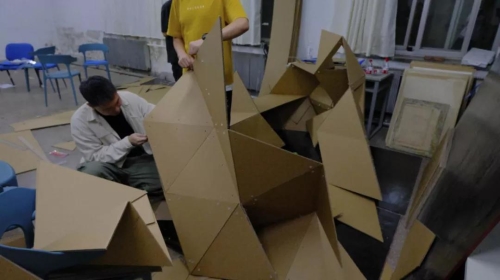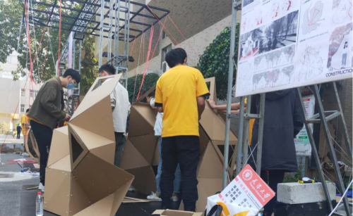 同时,因疫情的关系,线上讨论时无法预演实际搭建过程。是否能在大展当天仅有的8个小时内完成作品的搭建,是同学们最大难题。因此,在到达鲁美领取完材料后,我们立即开始搭建预演。在预演中,我们遇到了许多概念设计时不曾考虑到的实操问题。在集体力量下,这些问题都被一一攻克。