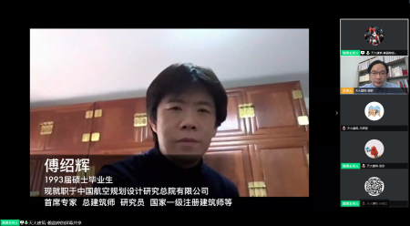 在论坛的交流访谈环节,邀请职业建筑大师,86级校友,中国航空规划设计研究总院有限公司首席专家、总建筑师傅绍辉作客会场,为学生们的就业困惑和职场努力提供点拨和指导。 傅绍辉先生从新时期建筑行业的发展趋势、新冠肺炎疫情可能对行业造成的影响、建筑求学者应具备的行业竞争力等多个角度。结合自己的从业经历和故事,为学生展开详细介绍,让在直播平台观看论坛的300余名学生收获颇丰。