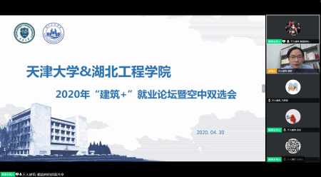 为充分贯彻落实党中央关于新冠病毒疫情防控工作的决策部署,多措并举做好疫情防控期间的就业工作。积极响应教育部发布的与武汉地区高校“一帮一”毕业生就业创业行动合作计划,在两校学生就业部门的大力协助下,天津大学建筑学院联合湖北工程学院建筑学院于4月30日上午9时,举办“海棠之约,云端会面”2020“建筑+”就业论坛暨空中双选会。论坛由天津大学建筑学院谢舒主持。