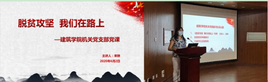 按照“党课开讲啦”活动要求,建筑学院党委严格落实“三会一课”制度,各党支部积极开展以“脱贫攻坚”为主题的党课活动。其中,机关党支部支部书记来琳老师带来题为《脱贫攻坚,我们在路上》的主题党课。来琳从中国扶贫历程、脱贫攻坚行动指南、脱贫攻坚具体举措等三个方面,具体分析了为什么要脱贫、如何脱贫、如何保证脱贫效果等重大理论和实践问题,进而深入学习“两个确保”的目标、“两不愁三保障”的标准、“六个精准”的扶贫方略和“五个一批”的实践路径等新思想、新观点、新论断,总结了“六个坚持”的基本经验,重点讨论了“扶持谁、谁来扶、怎么扶、如何退”等重要问题,进一步坚定了支部教职工决战脱贫攻坚的必胜信心。