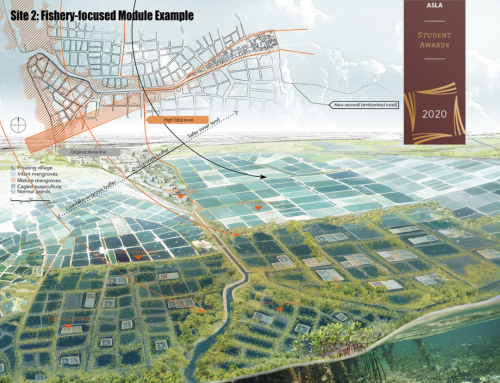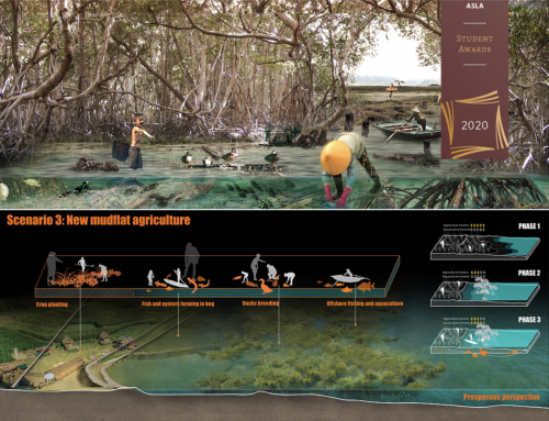 Project Statement: Human beings can build concrete armour at any cost to protect them from the sea, but not for everywhere. Titled‘Standing with Nature’, the concept challenges those that have often been understood as disastrous natural effects, and proposed a special way to take the advantage of nature to save the dying fringe coastal area of Kaohsiung, which is away from the port-centred prosperous metropolitan area well protected by giant concrete land-fill ports. This project sees the special endemic opportunities from current, sea-level rise and typhoon in restoration of the destructively damaged coastal mangrove habitat. With the voluntary regress caused by the gradual sea-level rise, such succession process leaves space for natural force and low-impact human intervention. By creating a forward biophilic landscape buffer along with death and life both for men and nature, a general coastal resilience is supposed to be promoted together with the permaculture development within and beyond the coast to meet a common prosperity at the currently declining coastal fringe.