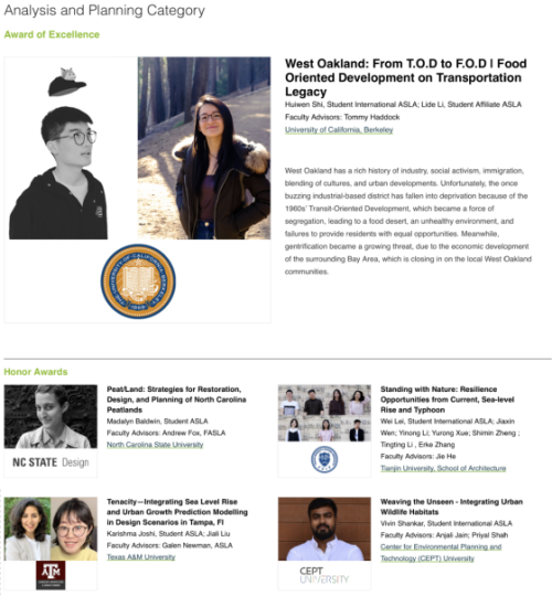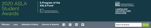 美国风景园林师协会每年向全球设计公司和高校师生征集作品,ASLAawards专业奖的历史可追溯1981年,学生奖的评奖始于2004年,是风景园林领域世界范围内行业认可度最高的奖项之一。ALSA学生奖分为通用设计、住宅设计、城市设计、分析规划、研究、传媒、学生合作、学生社区服务八大组别单元,每年来自全球约30个学生作品获得该荣誉。2020年国内高校共计5个作品获得ASLA学生奖。天津大学是分析规划组唯一获奖的国内高校,同时也是天津大学风景园林专业获得的首个ASLA学生奖。