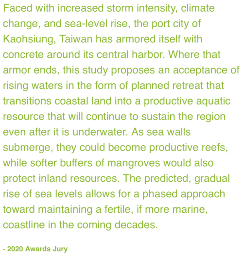 方案点评:“面对愈演愈烈的风暴、气候变化和海平面上升,港口城市高雄以坚固的高雄港为城市的发展中心。关注到高雄港的外围滨海区域,这项研究方案提出以规划的撤退来接纳不断上涨的海水将滨海的土地转变为即使是被淹没也能具有生产性价值的景观。当堤岸被淹没后,这些硬化的基础设施可以成为生产性的礁石,与此同时新生的红树林成为保护内陆的柔性缓冲。预期逐渐上涨的海平面成全了一种未来几十年间阶段性向富饶发展的过程,从海洋一直到更远的内陆。”