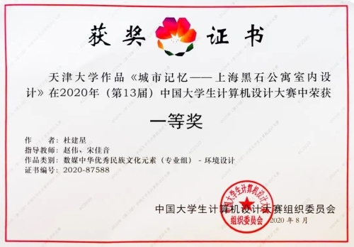 2020年(第13届)“中国大学生计算机设计大赛”省赛终评于6月27日线上进行,国赛终评于8月14日线上顺利举行。今年共有近 700 所院校组织了约 3 万件作品参加大赛。经过全国各省级赛区的选拔推荐,共有 4646 件作品入围国赛。天津大学建筑学院参赛作品“城市记忆——上海黑石公寓室内设计”荣获大赛省赛二等奖,国赛一等奖。