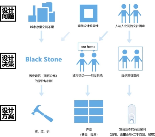 此次设计主要内容为在优秀历史建筑——黑石公寓中进行的以城市记忆为主题的“酒吧+”复合业态室内设计,复合业态包含酒吧、展廊和古董会所。基于现状调研,通过分析现存约束条件,总结设计语汇并提出发展的可能性,最终推导出设计的关键控制点,营造一个新的场所氛围,从而达到挖掘城市空间存量、保护并创新优秀历史建筑、提升社区活力的目的。