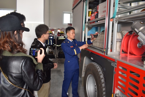 消防中队副队长先是带领研会成员参观了中队各班的宿舍、影音室等生活空间以及消防车库,并向研会成员详细介绍了消防车辆和相关设备的性能和现场用途。研会成员也亲身体验了部分消防设备的使用。种种沉重的设备,深切体会到了消防士兵工作的艰辛和消防安全的重要性。