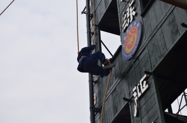 随后,副队长带领研会成员来到了训练场上,观摩消防官兵训练。官兵们展示了精湛的铺展水带的基本技能,迅速、到位的动作让人赞叹不已。之后的攀爬技能更是迅猛、利落,一气呵成。这些精湛技能的背后是日复一日、年复一年的辛苦训练,也正是这一身过硬的消防本领才给予这些可爱的消防士兵们迎火前行的勇气。训练结束,研会成员与中队的负责人就消防员的生活、训练、职业规划等进行了充分交流。
