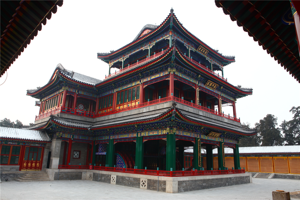 矗立在昆明湖畔的德和园大戏楼是清代三大戏楼之一。团队研究发现,该建筑群观演部分(戏楼、看戏殿、看戏廊)最初的设计方案竟是圆明园中最大的戏园——同乐园的“翻版”。当时的设计者把同乐园观演部分整体“搬”到了颐和园,却因地形合不上,将庭院、看戏廊、看戏楼等进行等比放大,而大戏楼因结构复杂则“照搬”。圆明园同乐园戏楼已经荡然无存,而德和园大戏楼如今依然气势恢弘。
