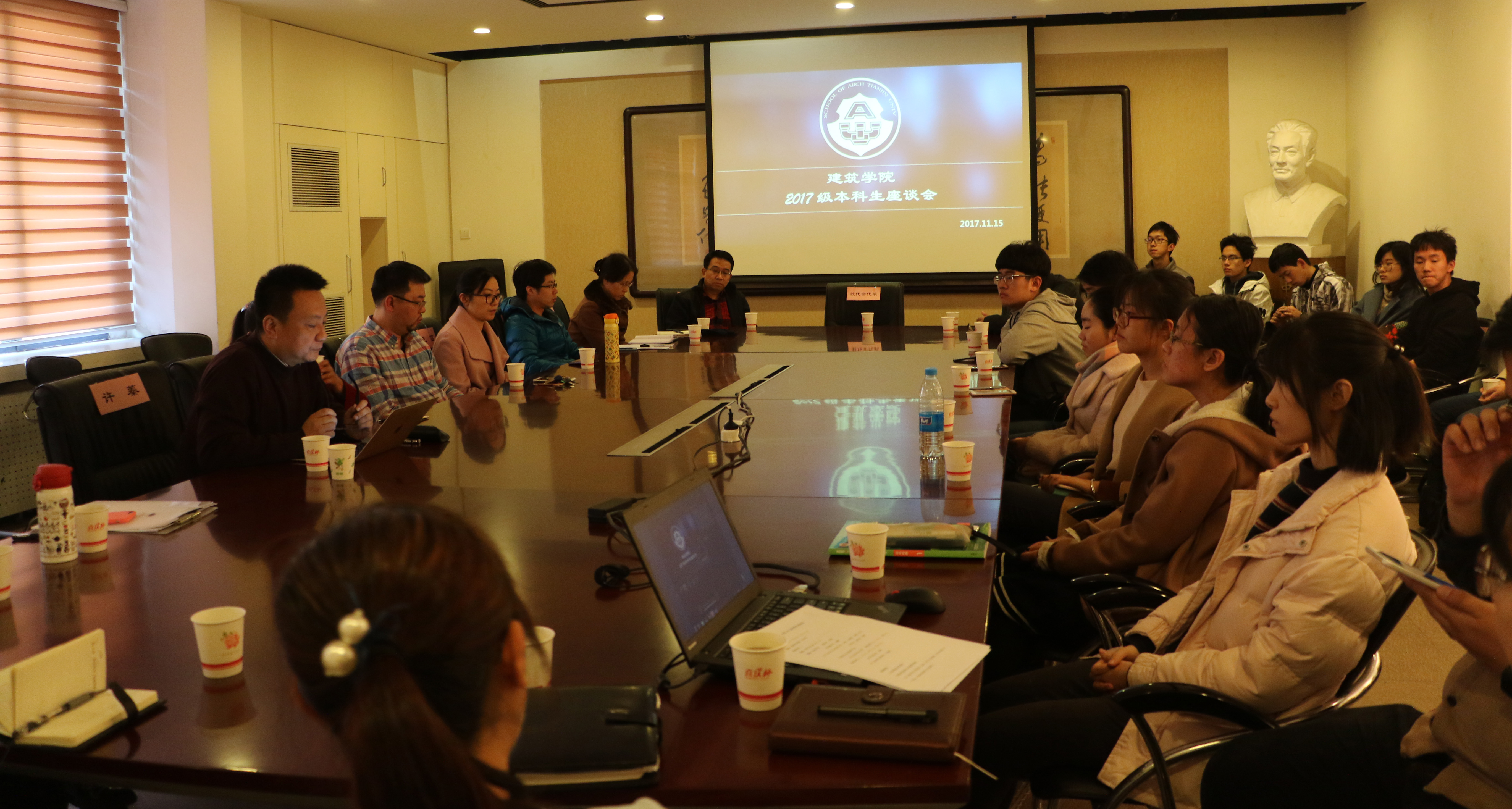 2017年11月15日下午3:30,建筑学院2017级本科生座谈会在建筑学院第一会议室举行。建筑学院副院长许蓁,党委副书记曾鹏,一年级设计课教学组组长袁逸倩,教师代表王苗、杨鸿玮、宋祎琳,班主任代表孙莉、刘魁星、张睿,本科教务员来琳,2017级本科生辅导员张建斌,以及一年级部分学生代表参加了本次座谈会。此外,自动化等兄弟学院教代会代表也出席了本次活动。