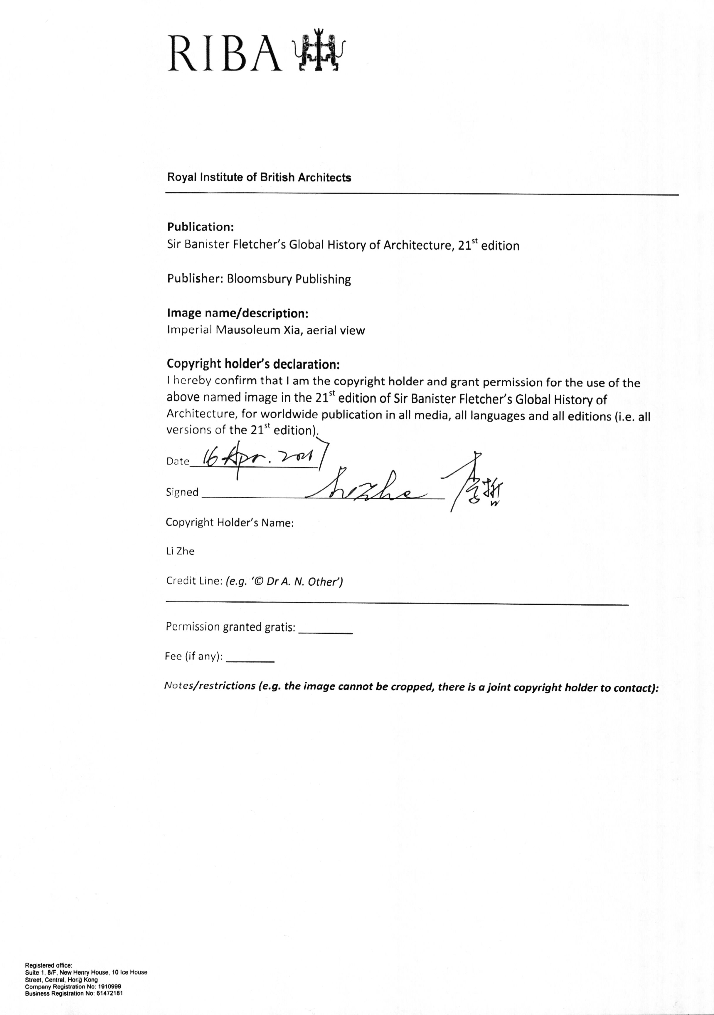 4月9日,英国皇家建筑学会给李哲老师发邮件,信中表达了希望能将其无人机建筑摄影作品《西夏王陵》收录入本尼斯特 弗莱彻爵士(Sir Banister Fletcher)的《世界建筑史(21世纪版)》一书中。