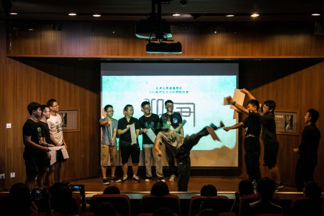 在欢快的气氛中,晚会很快进行到了数字蹲的游戏环节。来自5个班的九位同学踊跃参与。游戏环节紧张生动,最终有三位同学坚持到最后,获得了精美的纪念奖品。晚会也在一阵笑声中精彩继续。4班于君涵同学独唱的《秋意浓》深情款款,3班三人合唱的《唱歌的孩子》引人入胜,5班张尧钦同学的口琴独奏曲韵悠长,而一段配乐诗朗诵《热爱生命》更是展现了建院学子的昂扬风貌,又一次将晚会的气氛推向了高潮。在一段古琴独奏之后,由1班同学带来的配音视频表演在一位学生的搞笑独白中爆笑开场。一个个段子令现场同学们目不暇接,笑声掌声此起彼伏。紧随其后的5班情景剧也是笑度不减,天津味儿的搞怪演绎令同学们捧腹。在一阵欢声笑语中,整场晚会也接近了尾声。2班同学最后为大家带来了一段歌曲串烧《致青春》,在唤起大家青春记忆的同时,也将今夜欢聚的美好留在了2016级每位硕士新生的心间。