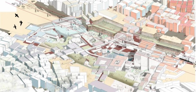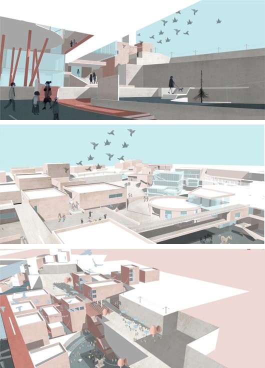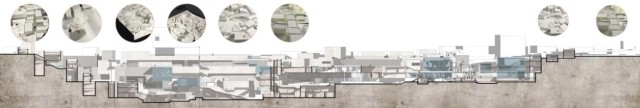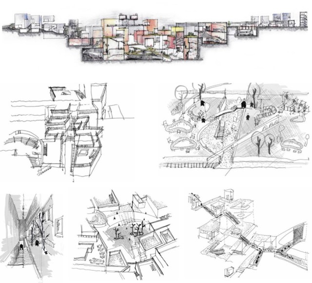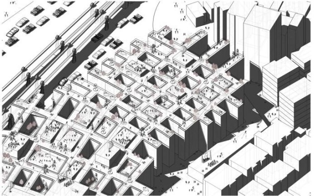 地面和地下的多层平台:0至-8米的公共交通层,连接城中村、地铁、公交,是最具城市公共性的,最热闹的区域;从-8米可以下到-20米平台,这个平台有很多绿地,周围的建筑逐渐向大肌理过渡;最下方是-30米平台,这个平台只存在于-8米交通环中心的正下方,它作为社区中心及俱乐部是整片区域最核心的部分