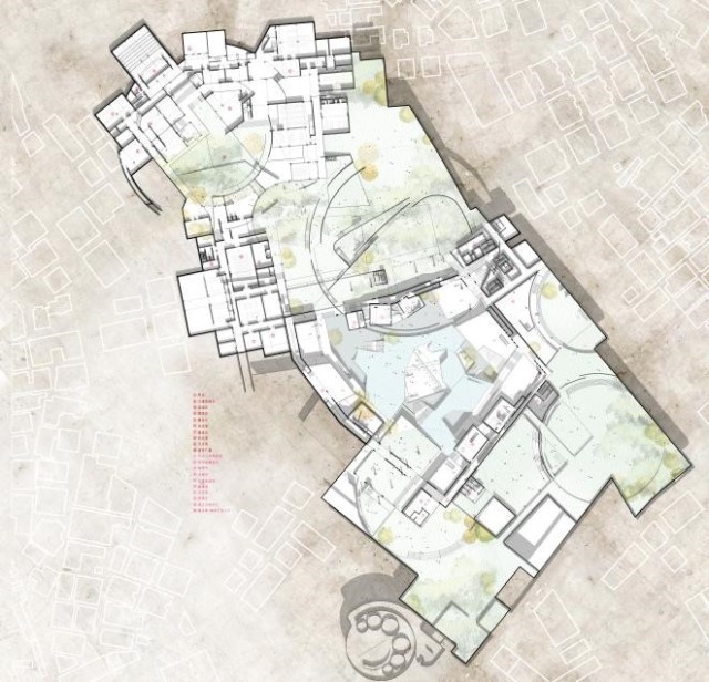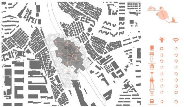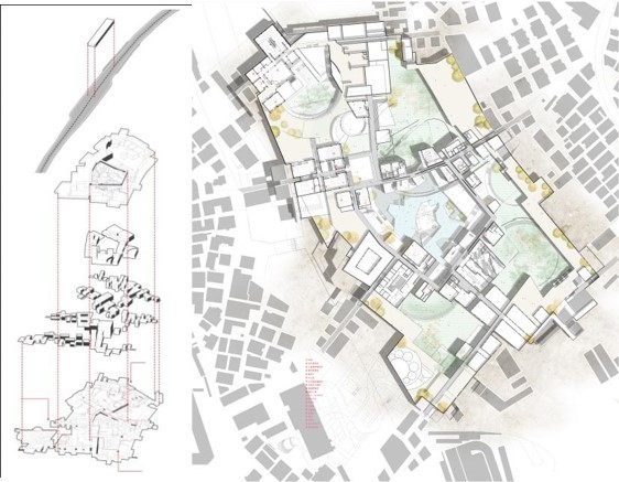 根据场地周边功能调研,依据不同位置的光照与声音条件,我们对所需功能进行了规划。最终形成5大主要功能环,分别为交通联系环、文化服务环、商业售卖环、集会展览环与社区活动环。这五大功能环位于场地内不同网格位置与标高层次。统率周边功能性质,完成建筑肌理块的连接。