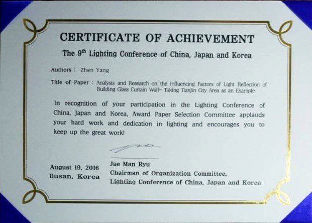 杨侦同学的论文《Analysis and Research on the influencing factors of light reflection of building glass curtain wall》被大会组委会评选为2016届中日韩照明“优秀论文”。