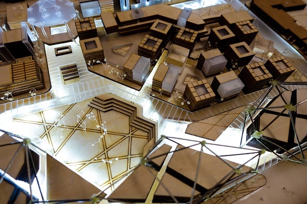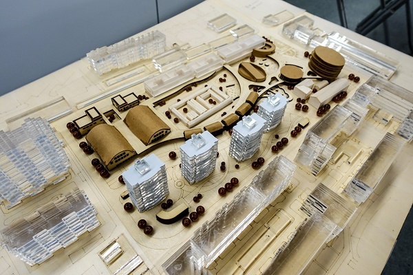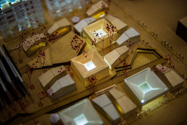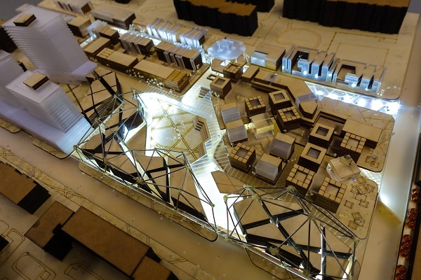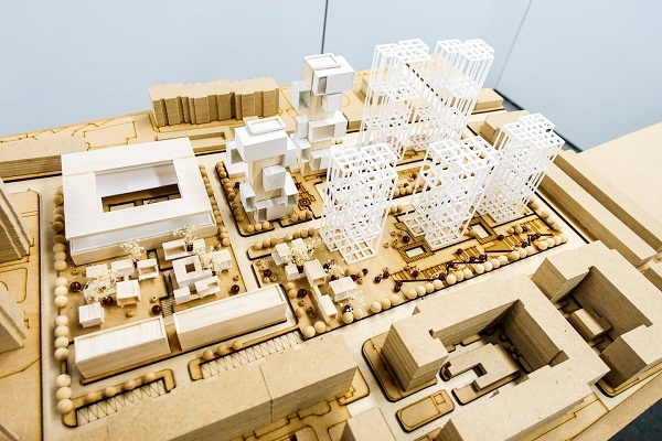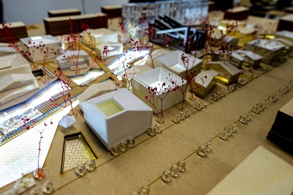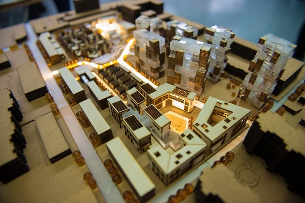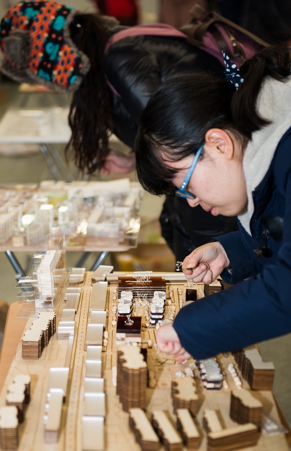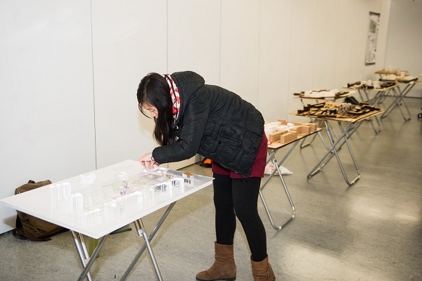 9日,十九组方案布展停当,十点多钟,第一波参观者汹涌而至,略显冷清的现场立刻火热起来,同学们各自守着自己的“摊位”,第一次有紧张也有兴奋感,多年以来评图讲方案的严肃和紧张感还是挥之不去。渐渐的,随着一遍遍的叙述阐释,那些方案构思、理念生成已经是呼之欲出的东西,更吸引人的是与众多参观者的交流和碰撞:往常汇报完一次方案后,或多或少都会有遗漏不全的地方,不免有些遗憾,而这样的形式让我们得以一遍遍的说,一遍遍的自己梳理思考过程,更兼观众们能提出各种不同角度的问题,提到自己做方案时都想不到的深度,帮助方案更加丰满,同学们在接待下一位观众时也就更加自信轻松。