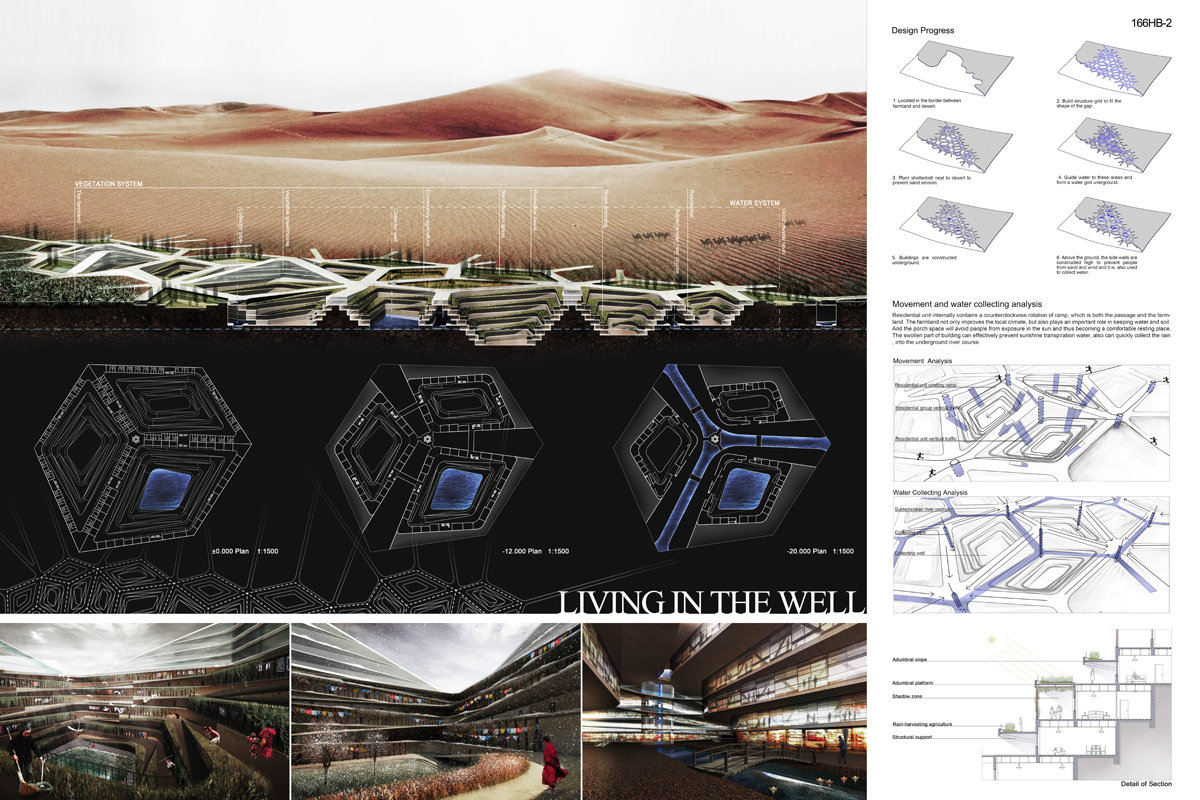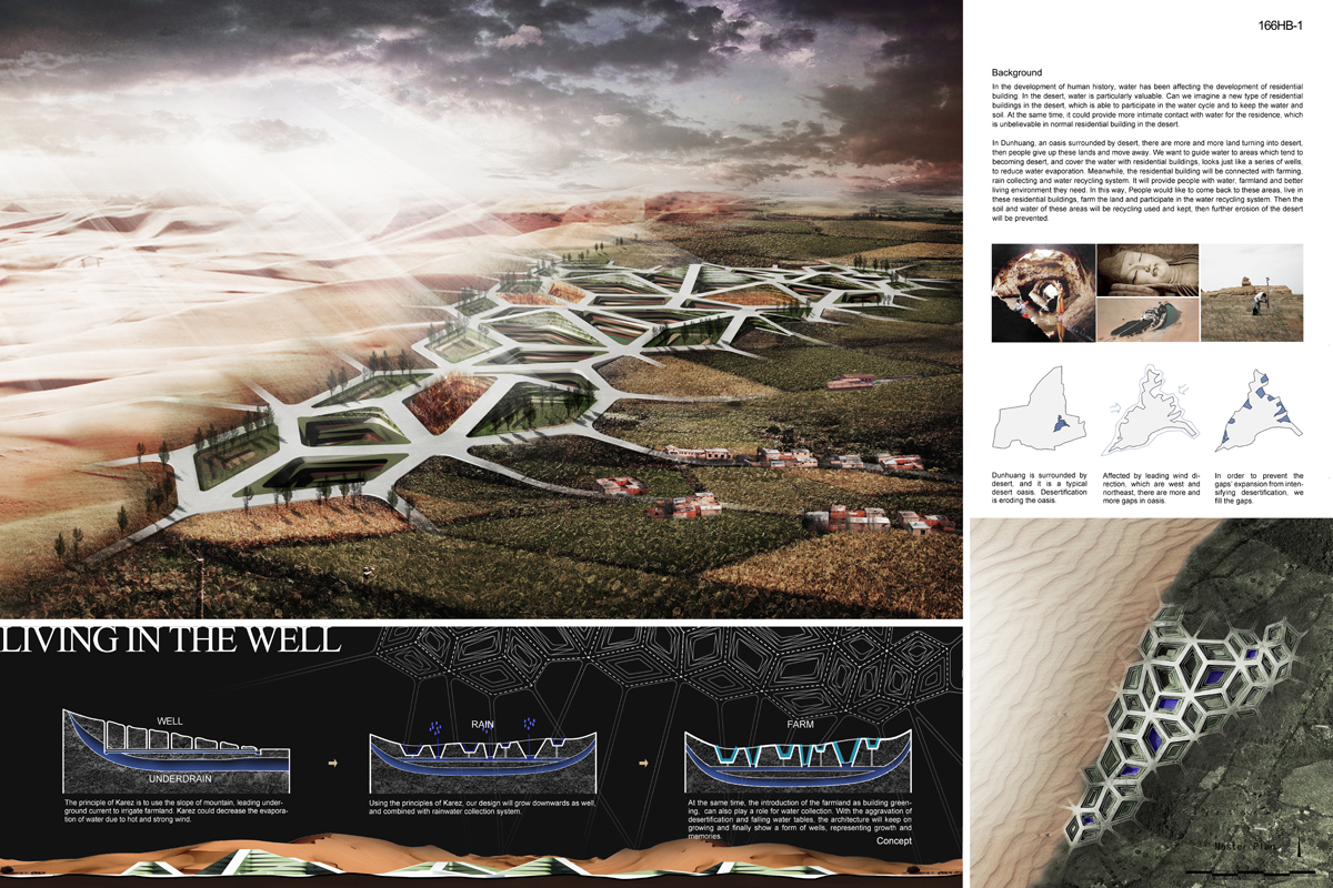 设计者关注敦煌的沙漠化问题,沙漠的侵蚀迫使人们迁离栖息地。方案用井的形式将居住空间与水源紧密结合,创造性地重组人们逐水而居的生活模式。