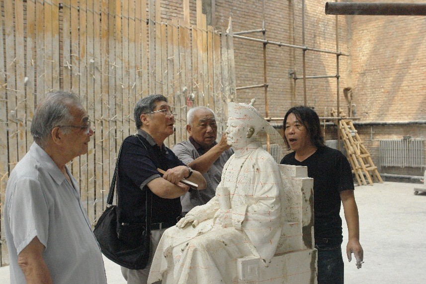 章又新(左一)、黄为隽(左二)、彭一刚(左三)正在指导雕像小样的修改细节