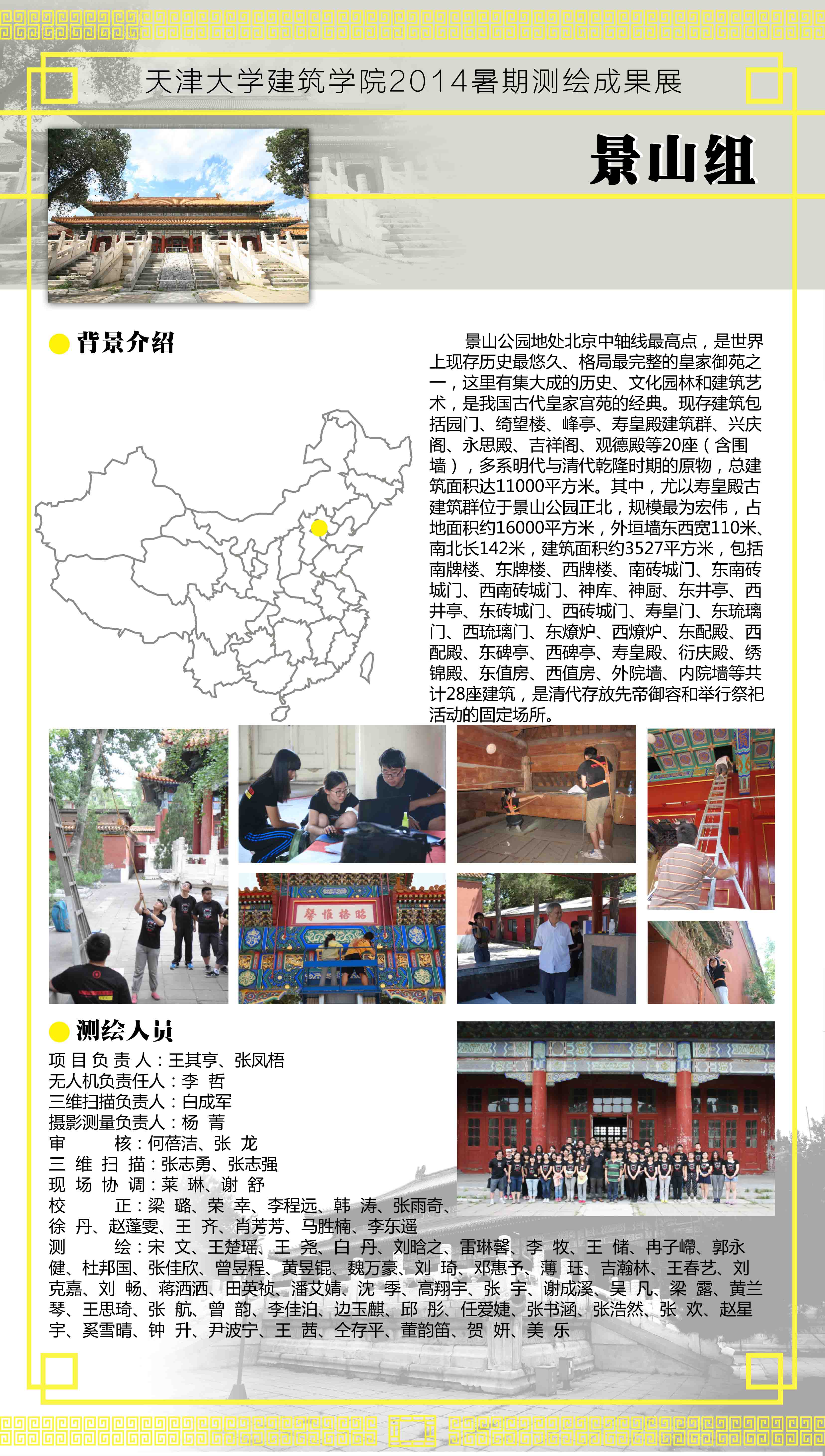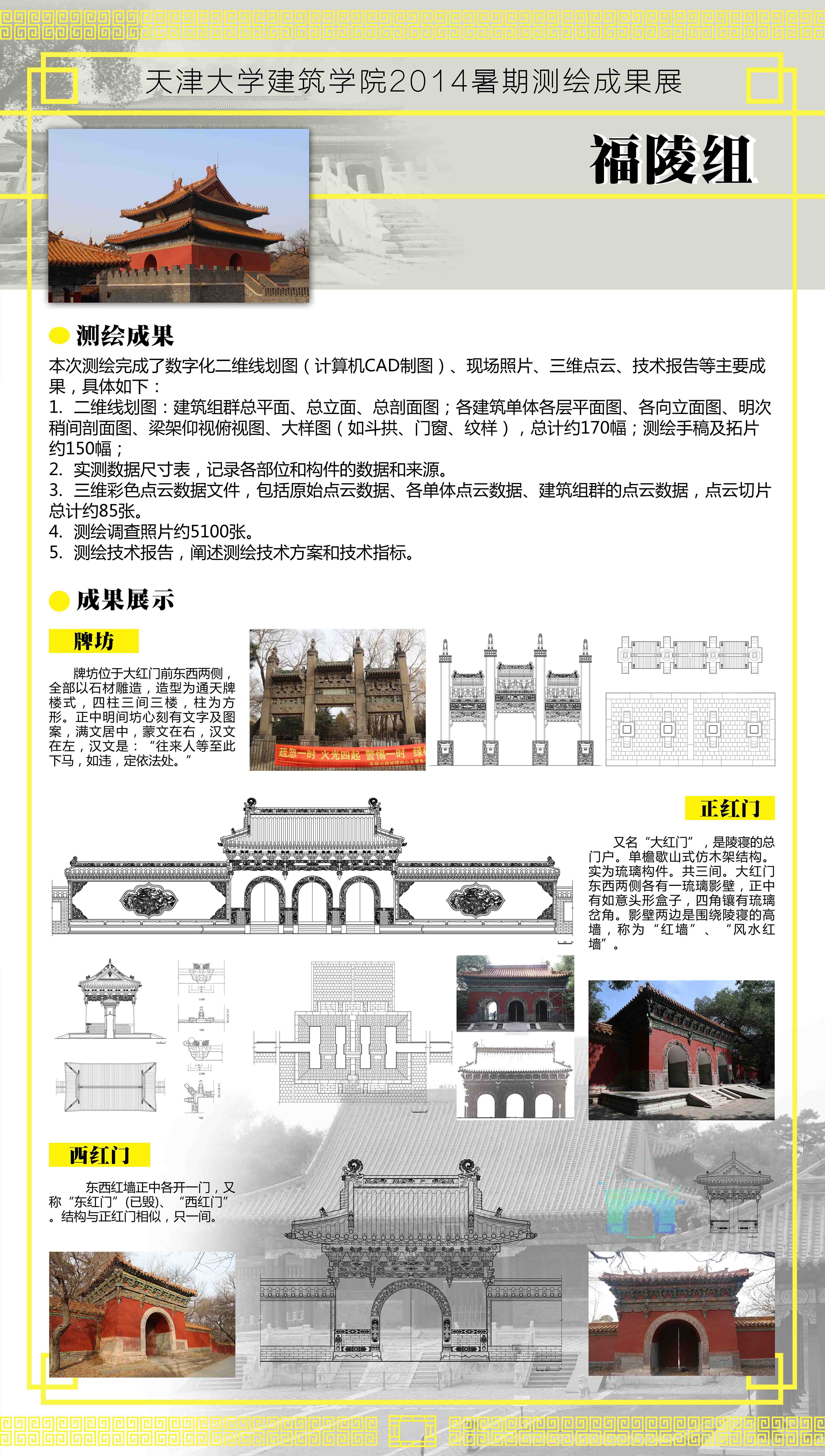 日前,建筑学院2014年古建筑测绘实习成果展在学院二楼展厅拉开帷幕。本次展览是2012级同学去年暑期测绘实习的总结及成果展示,包括北京景山、沈阳福陵、无锡惠山祠堂群、蔚县古建筑和嘉峪关关城等世界遗产地、全国重点文物保护单位的测绘成果。
