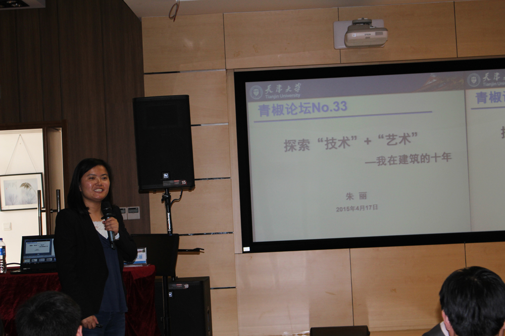 2015年4月17日,我院朱丽教授受邀做客天津大学第33期青椒学术沙龙,为广大师生带来了一场主题为“探索“技术”+“艺术”—我在建筑的十年”的讲座,吸引了建筑学院、环境学院、化工学院、机械学院、精仪学院、药学院等多个学院约六十余名师生参加。本期沙龙由青年教师联谊会理事、建筑学院讲师郭娟利老师主持。