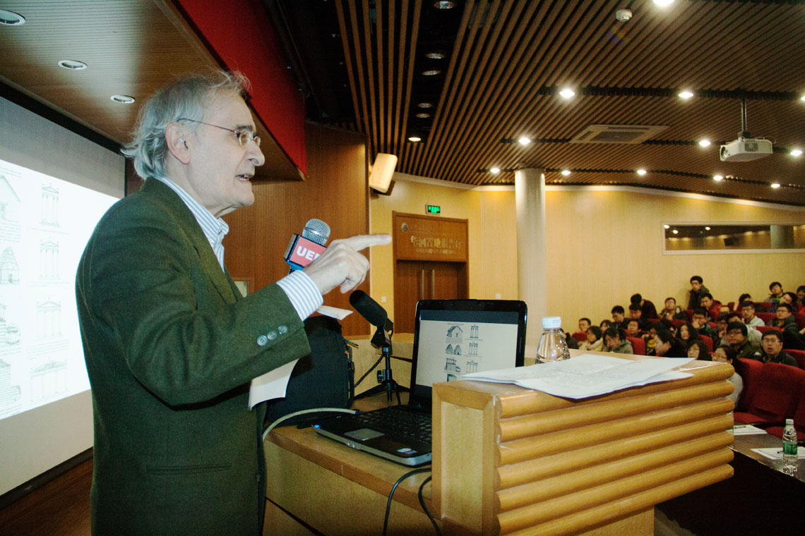 本次大师讲堂有幸邀请到荷兰代尔夫特理工大学荣誉退休教授,“批判性地域主义”(Critical Regionalism)理论创始人亚历山大·楚尼斯(Alexander Tzonis)教授进行了以“批判性地域主义:一次永无休止的反响“为题的演讲。演讲由天津大学建筑学院副院长许蓁主持,建筑学院教师盛强作现场翻译。在演讲中,楚尼斯先生回顾了地域主义和批判性地域主义发展的历史脉络,并从两个方面对批判性地域主义的发展现状进行解析: 其一,对建筑界有关批判性地域主义的争论进行探讨;其二,对批判性地域主义的概念进行澄清,阐释建筑师应如何利用这一理念指导设计实践。”批判性地域主义“概念于1975年由亚历山大·楚尼斯首次提出,是一种对”后现代主义“忽略现实及文化问题,以及”全球化“造成的扁平世界的回应。他认为建筑师真正应该具有的是整体考量下的观念回归,以现实主义的态度去做设计,回应环境、地域和文化。