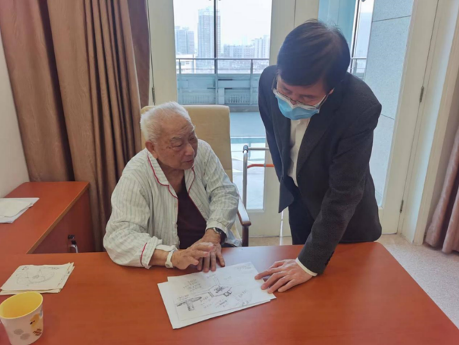2019年天津大学党委书记李家俊到医院看望彭先生,彭先生介绍天津大学新校区环境设计方案