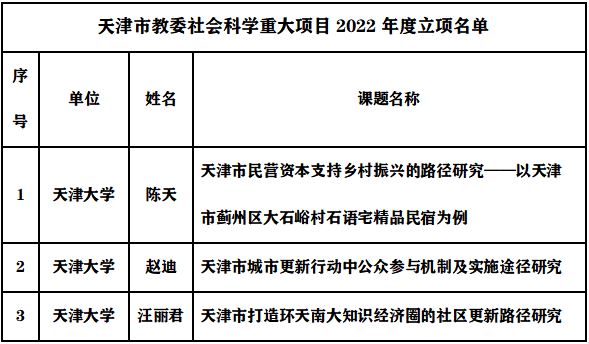 根据《天津市教委社会科学重大项目管理办法》规定,经公开申报、专家初评评审和复评评审等程序,天津市教育委员会公布了天津市教委社会科学重大项目2022年度立项名单。我院教师积极申报,并获批3项重大项目。