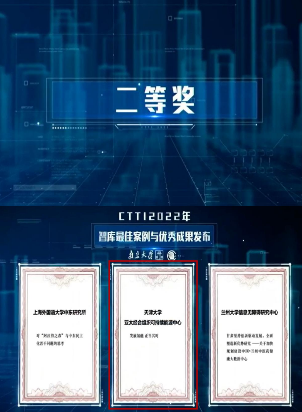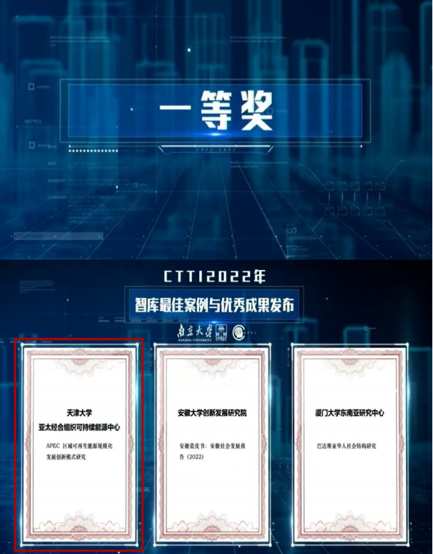 论坛重磅发布了 CTTI2022 年度增补来源智库名单、智库建设最佳案例和优秀成果获奖名单。经专家严格审议和评定,我院“天津大学城市更新与发展研究院”成功入选来源智库名单;APEC可持续能源中心报送的《深度服务国家能源战略 推动能源智库高质量发展》智库建设案例,荣获“CTTI2022年度智库建设示范案例”;中国文化遗产保护国际研究中心报送的《中国城市近现代工业遗产保护体系研究》荣获“CTTI2022 年度智库优秀成果特等奖”;APEC可持续能源中心报送的《APEC 区域可再生能源规模化发展创新模式研究》、《发展氢能 正当其时》两项研究成果,分别荣获“CTTI2022 年度智库优秀成果一等奖、二等奖”。