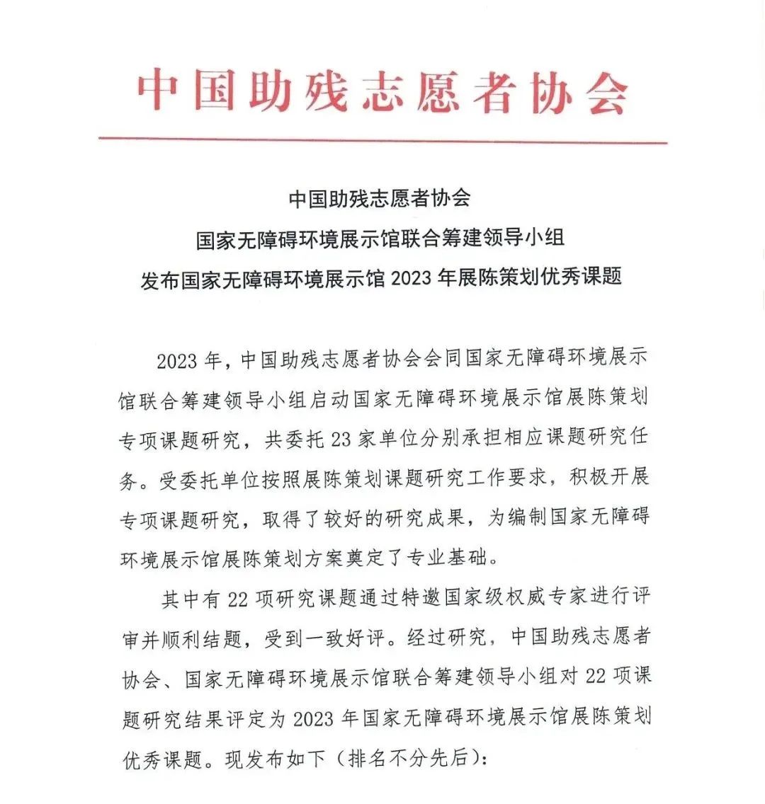 2023年,中国助残志愿者协会会同国家无障碍环境展示馆联合筹建领导小组启动国家无障碍环境展示馆展陈策划专项课题研究,共委托23家单位分别承担相应课题研究任务。受委托单位按照展陈策划课题研究工作要求,积极开展专项课题研究,取得了较好的研究成果,为编制国家无障碍环境展示馆展陈策划方案奠定了专业基础。