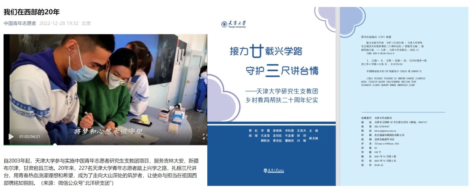组织创作20周年歌曲MV《你的模样——我们在西部的二十年》,获中国青年报等10+媒体头版报道,播放量超10万。作为副主编收集整理天大研支团影像、文字,汇编七万余字的二十周年纪实书籍,用心用行讲好天大青年爱国奉献的故事。