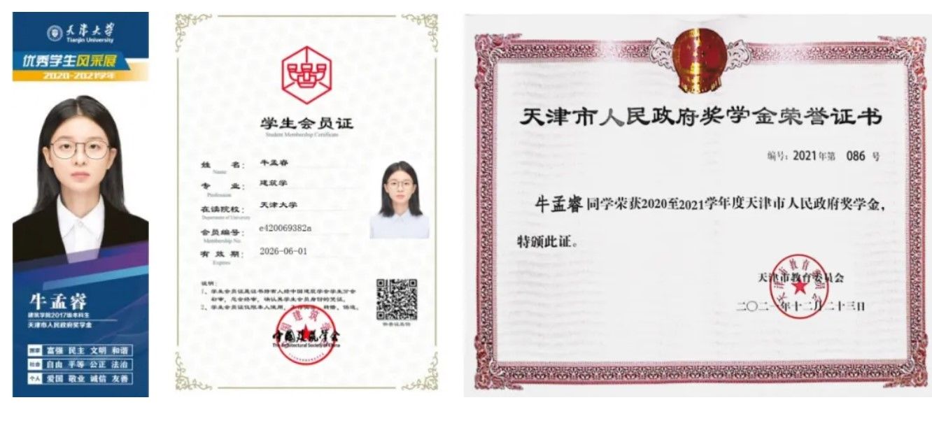 带着对中国古建筑的热忱,实现从年级45到年级第2、加权92.9的跨越。入选中国建筑学会学生会员、获天津市人民政府奖学金、天津大学优秀毕业生等50+项个人荣誉。