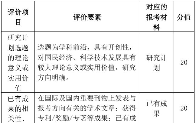 3)材料审核小组对报名材料进行认真评审,以评分方式(百分制,评价要素和分值详见下表)以一定差额确定初审合格的考生名单。