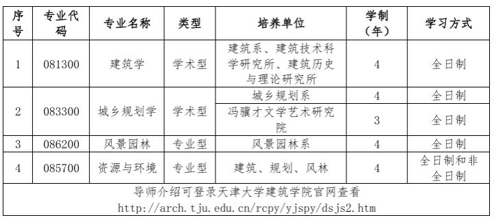 天津大学建筑学院有4个博士招生专业(详见下表)。目前学术型博士学位研究生已经开始报名(第一阶段2024年10月29日—2024年11月25日(中午12时系统关闭),第二阶段2025年3月6日—2025年3月27日(中午12时系统关闭)),专业型博士报名开始时间另行通知。