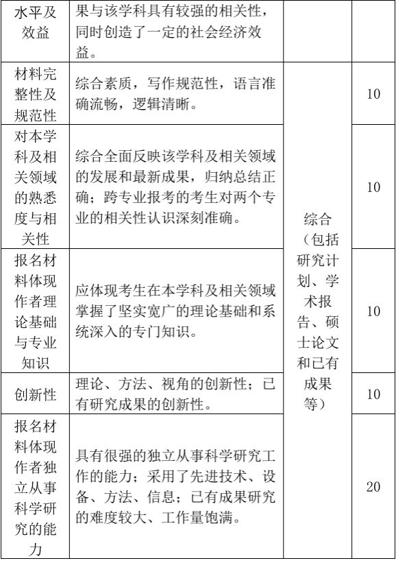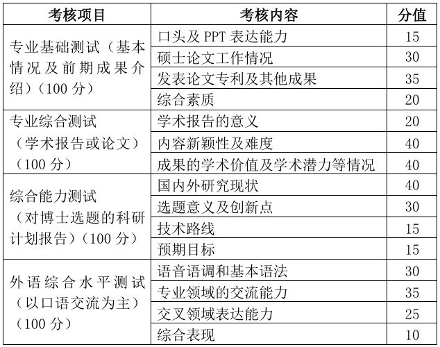 综合考核办法:学院将组织专家组对申请材料初审合格的申请人进行综合考核。考核项目包括专业基础测试、专业综合测试、综合能力测试和外语综合水平测试四部分内容。各科成绩满分为100分。总成绩折合为100分。