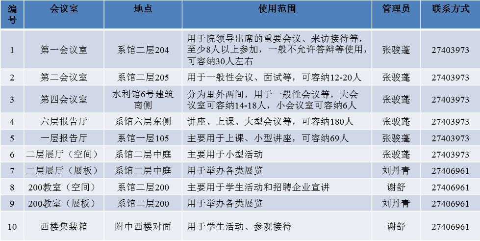 会议室的使用时间分为上午(8:00-12:00)、下午(13:00-18:00)、晚上(18:00-21:00)三个时间段,会议室的申请、审批、管理由学院负责;多媒体设备的使用与维护、会议室服务与卫生由物业负责。