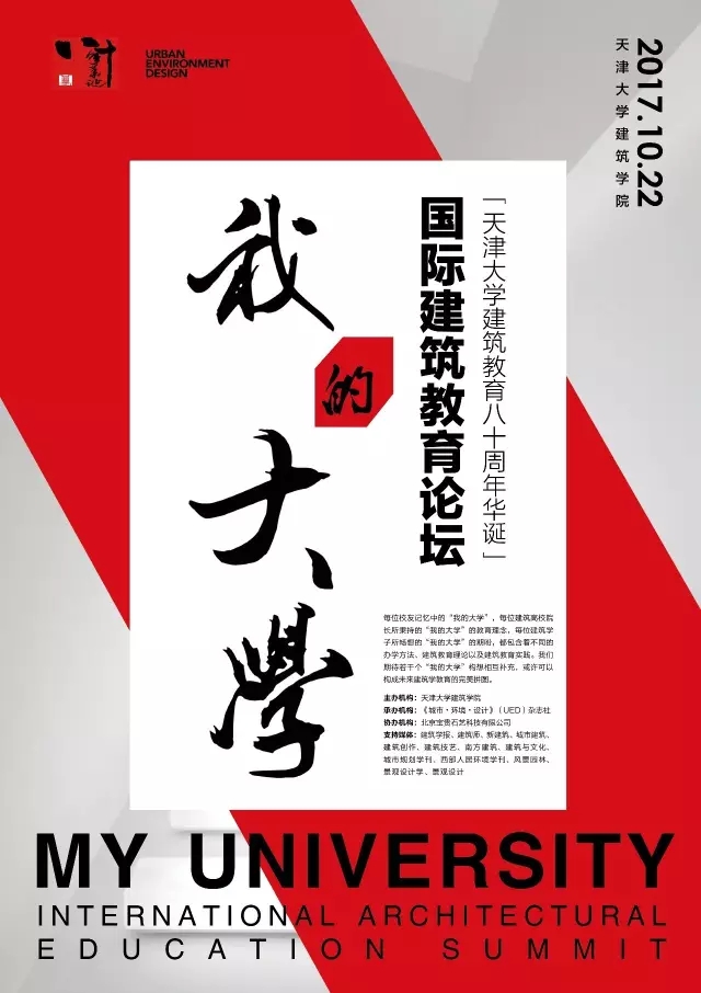 值此机会,由天津大学建筑学院主办,《城市 · 环境 · 设计》(UED)杂志社承办的“我的大学”——国际建筑教育论坛,将于2017年10月22日举行。这是一次老校友的叙旧,毕业于天津大学建筑系不同年级的校友将聚在这里,聊聊他们记忆里的大学;也是一次建筑教育的畅谈,来自国内外30余位著名建筑学院的院长和专家将就建筑教育的前行方向和国际建筑教育模式进行交流探讨。