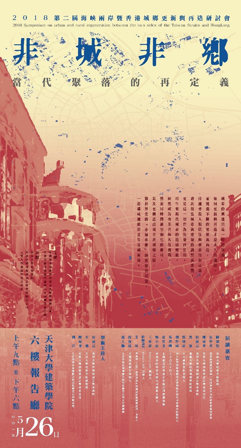 第二届海峡两岸暨香港城乡更新与再造研讨会将于2018年5月26日在天津大学建筑学院举行,主题为“非城非乡:当代聚落的再定义”,旨在探讨如何从城乡建设走向城乡经营与再定义,用城乡空间的存量创造出新价值与意义。本届研讨会邀请海峡两岸的专家学者,交流探讨其面对城乡问题的经营策略,透过不断的更新与再造,持续寻找人类居住与聚落的新定义。