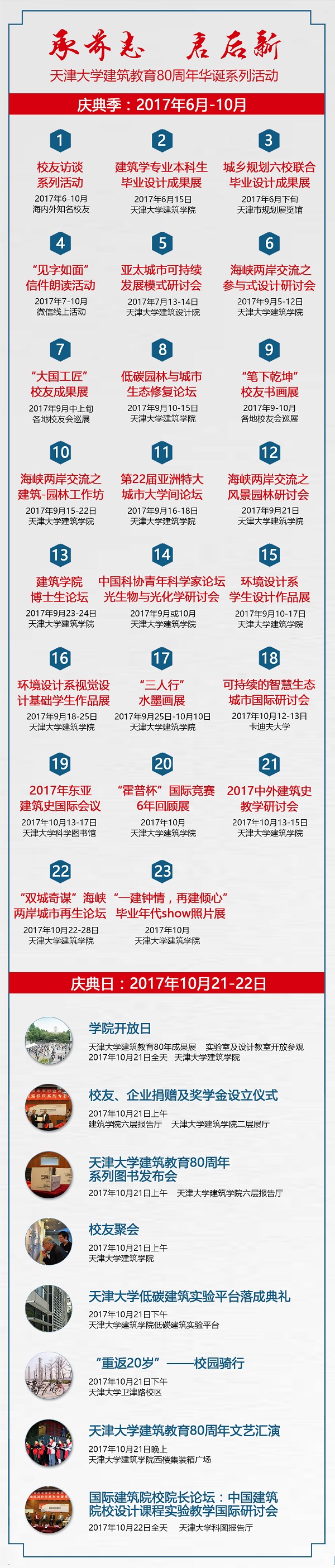 天津大学建筑教育80周年华诞“庆典季”为2017年6至10月,“庆典日”为2017年10月21至22日,具体日程安排如下图所示: