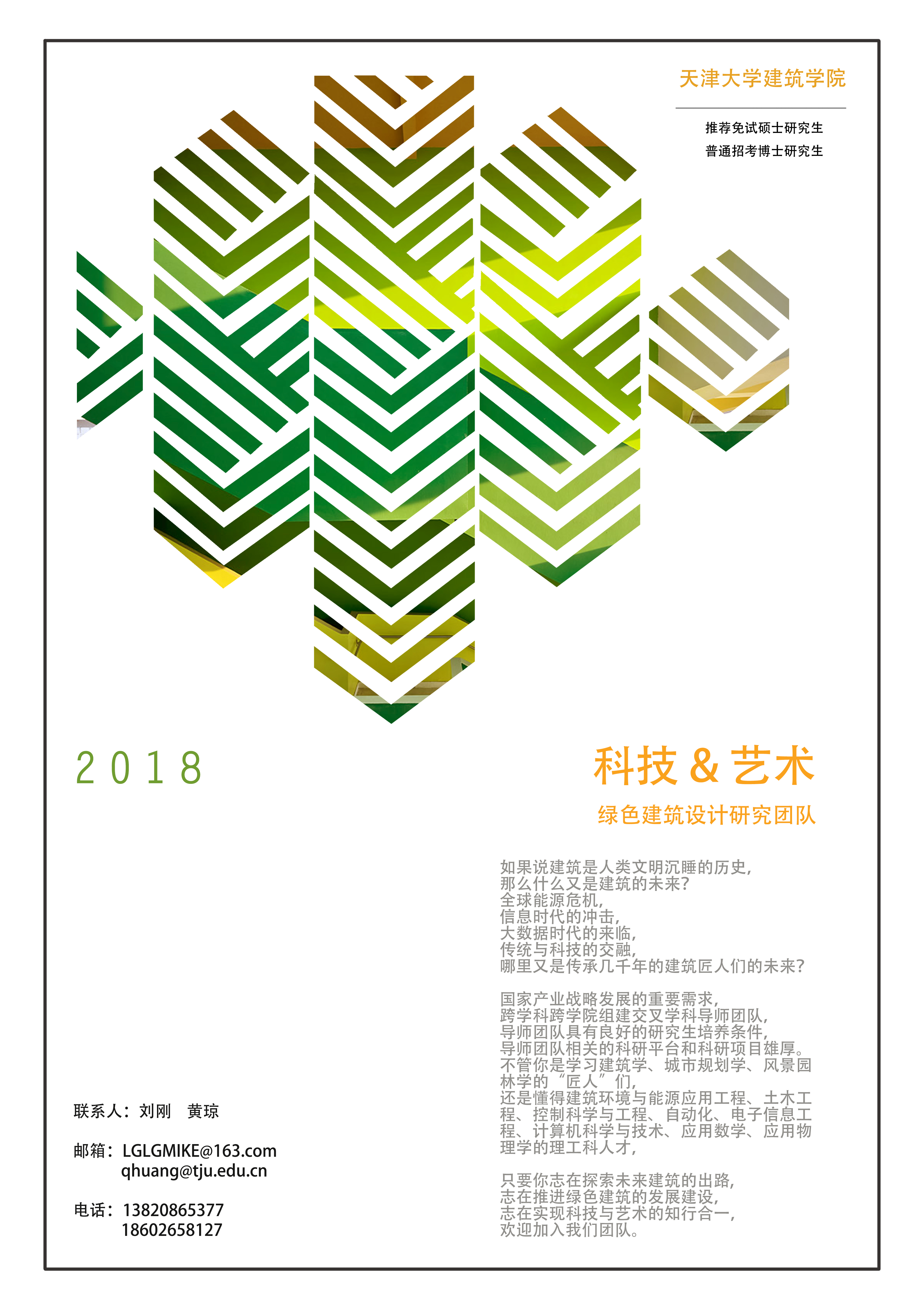 科技与艺术--绿色建筑设计研究团队研究方向包括:绿色建筑设计及其理论、建筑性能分析和参数化设计、绿色建筑主被动技术等方面。计划招生数量为:硕士研究生8名,博士研究生4名。要求学生专业基础扎实,具有较强的科研能力和团队合作精神。
