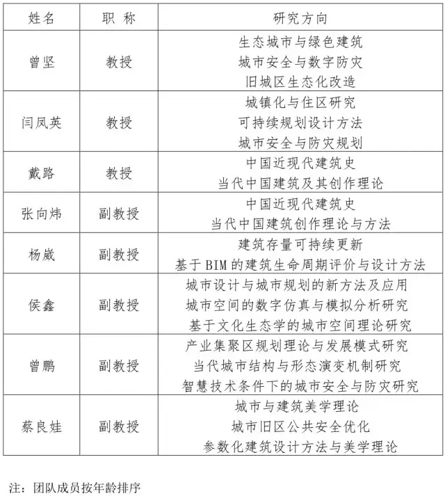 团队负责人曾坚教授是中国城市规划领域的知名专家,主要研究方向为:建构基于数字技术的快速城镇化典型衍生灾害防治规划理论;针对城镇化新阶段存量规划的需求,研究旧城区生态化改造的理论与方法;拓展面向信息社会的建筑与规划设计理论。作为天津大学城市规划学科学术带头人,目前已培养近30名城市规划及建筑学工学博士,有力的支持了城市规划和建筑事业的发展。获宝钢优秀教师奖1项;全国优秀村镇规划设计一等奖1项(排名第一);教育部自然科学奖一等奖1项(排名第二);天津市科技进步二等奖1项(排名第二);天津市总体规划(2005-2020)修编先进个人。