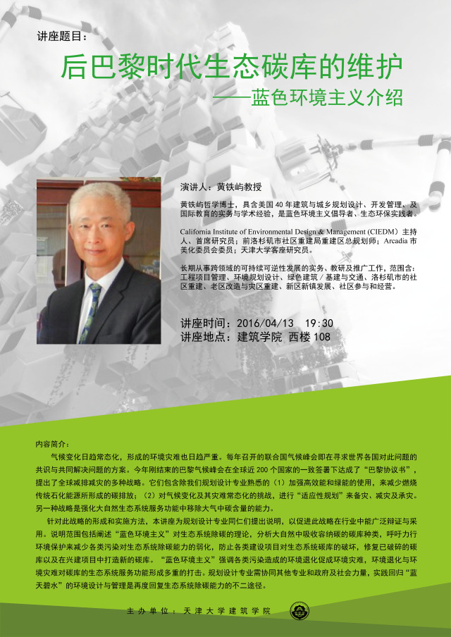 气候变化日趋常态化,形成的环境灾难也日趋严重。每年召开的联合国气候峰会即在寻求世界各国对此问题的共识与共同解决问题的方案。今年刚结束的巴黎气候峰会在全球近200个国家的一致签署下达成了“巴黎协议书”,提出了全球减排减灾的多种战略。它们包含除我们规划设计专业熟悉的(1)加强高效能和绿能的使用,来减少燃烧传统石化能源所形成的碳排放;(2)对气候变化及其灾难常态化的挑战,进行“适应性规划”来备灾、减灾及承灾。另一种战略是强化大自然生态系统服务功能中移除大气中碳含量的能力。针对此战略的形成和实施方法,本讲座为规划设计专业同仁们提出说明,以促进此战略在行业中能广泛辩证与采用。说明范围包括阐述“蓝色环境主义”对生态系统除碳的理论,分析大自然中吸收容纳碳的碳库种类,呼吁力行环境保护来减少各类污染对生态系统除碳能力的弱化,防止各类建设项目对生态系统碳库的破坏,修复已破碎的碳库以及在兴建项目中打造新的碳库。“蓝色环境主义”强调各类污染造成的环境退化促成环境灾难,环境退化与环境灾难对碳库的生态系统服务功能形成多重的打击。规划设计专业需协同其他专业和政府及社会力量,实践回归“蓝天碧水”的环境设计与管理是再度回复生态系统除碳能力的不二途径。