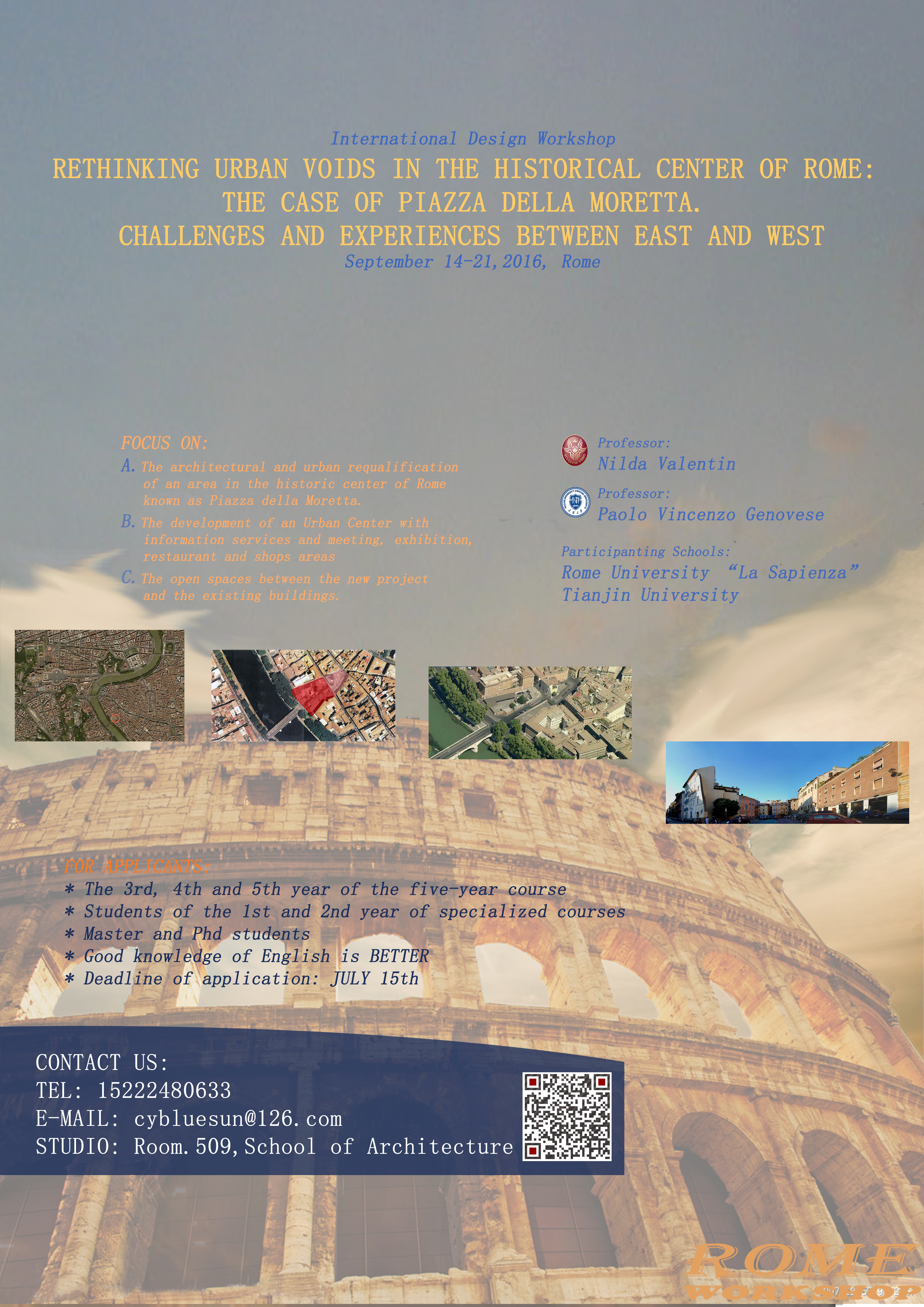 此次workshop以位于意大利罗马历史区的Piazza della Moretta广场为实践载体,分析现代城市建设与古城历史遗迹保护之间的协调发展关系,探索在信息化、商业化的时代,兼顾“新”与“旧”和谐共生的公共空间设计策略和城市更新研究。