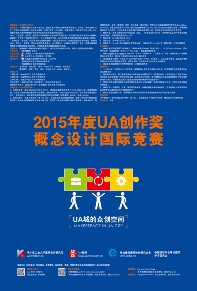 今天,以大数据、云计算、物联网为代表的新一代信息技术风起云涌,推动着知识社会的形成和创新模式的嬗变,世界进入了以用户为中心、以社会实践为平台、以协同创新和开放创新为特点的创新2.0时代。“众创空间”是创新2.0时代的创新创业模式探索,通过市场化机制、专业化服务和资本化途径,构建低成本、便利化、全要素、开放式的创业服务平台。本次竞赛以“UA城的众创空间”为题,希望参赛者畅想创新2.0时代的创新创业模式,并提出更富预见性的建筑解决方案。